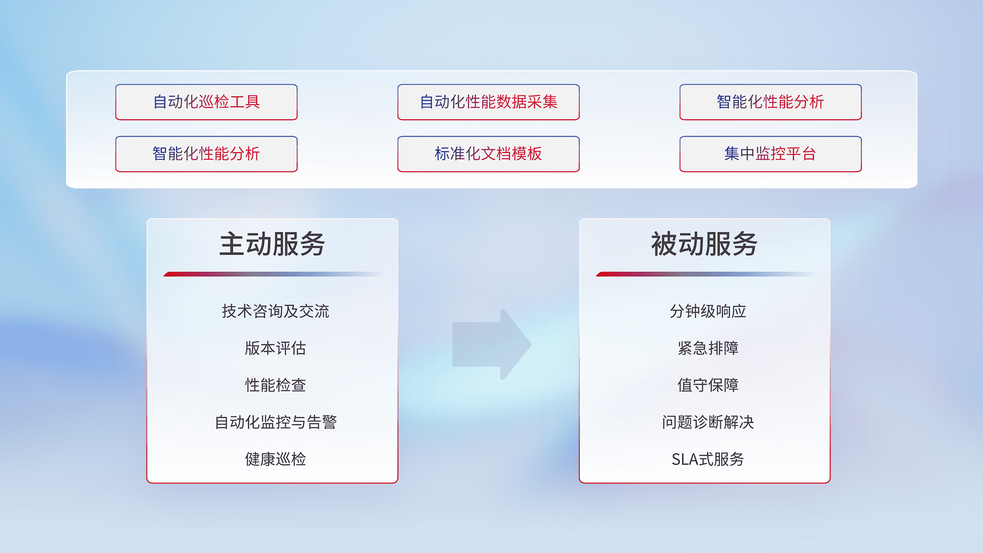 智能化工具和标准化文档,,保障服务质量,,,,提供主动服务(包含技术咨询、、、、版本评估、、、性能检查、、、、自动化监控与告警、、健康巡检)和被动服务包含(分钟级响应、、、紧急排障、、、、值守保障、、、问题诊断解决、、SLA服务)。。。